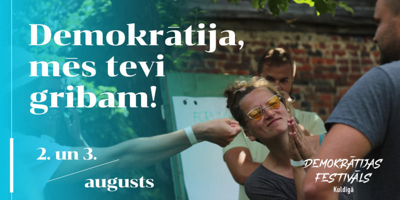 Demokrātija, mēs tevi gribam – ar šo saukli Demokrātijas festivāls Kuldīgā šogad aicina piedalīties ikvienu, kurš vēlas demokrātiju izspēlēt, aprunāt, uzgleznot, pagaršot, piedzīvot. Festivāls notiks 2. un 3. augustā, Kuldīgas vecpilsētā ap Adatu torni (Liepājas ielā 37).