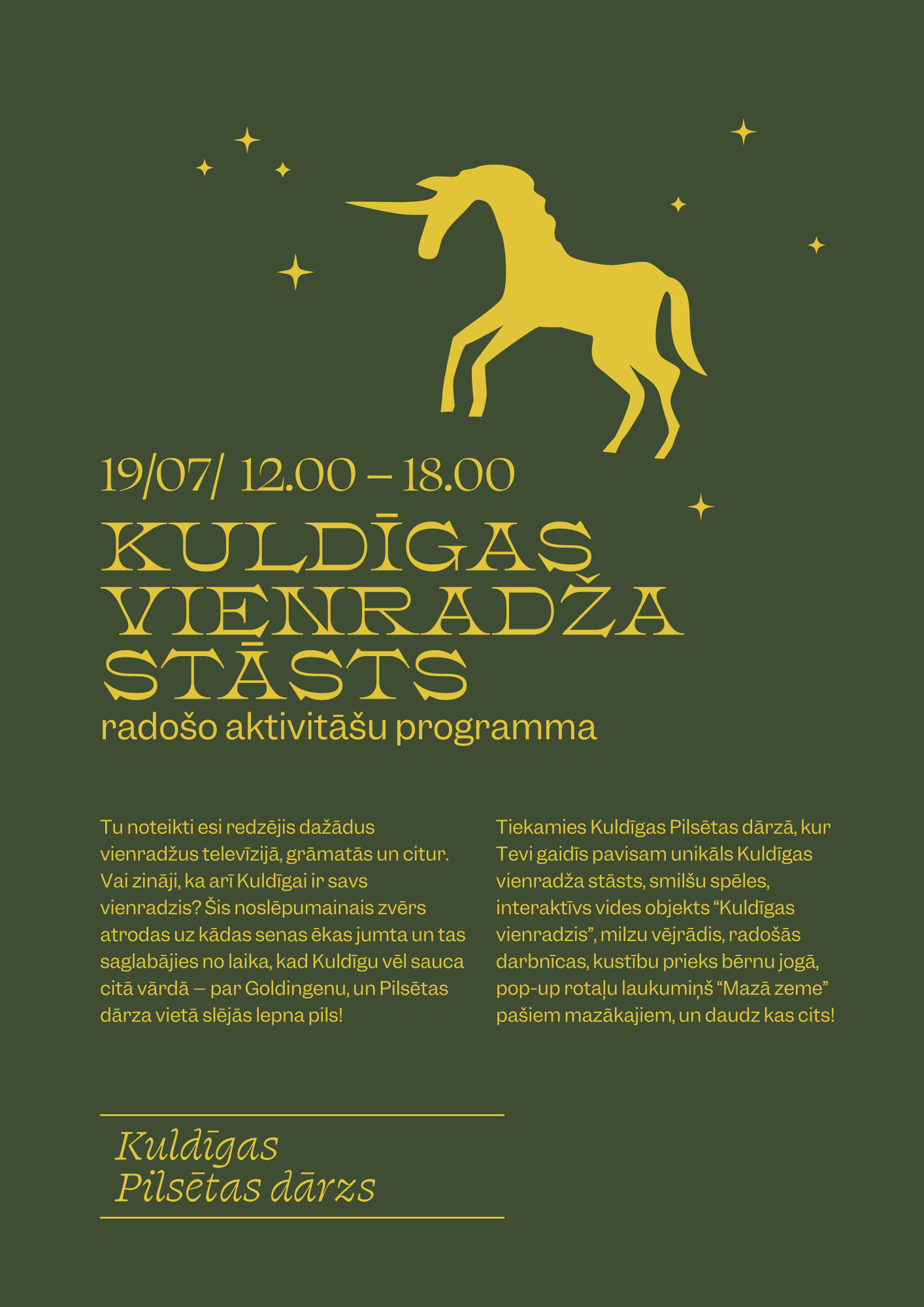 Tu noteikti esi redzējis dažādus vienradžus televīzijā, grāmatās un citur. Vai zināji, ka arī Kuldīgai ir savs vienradzis? Šis noslēpumainais zvērs atrodas uz kādas senas ēkas jumta un tas saglabājies no laika, kad Kuldīgu vēl sauca citā vārdā – par Goldingenu, un Pilsētas dārza vietā slējās lepna pils! Tiekamies Kuldīgas Pilsētas dārzā, kur Tevi gaidīs pavisam unikāls Kuldīgas vienradža stāsts, smilšu spēles, interaktīvs vides objekts “Kuldīgas vienradzis,” milzu vējrādis, radošās darbnīcas, kustību prieks bērnu jogā, pop-up rotaļu laukumiņš “Mazā zeme” pašiem mazākajiem, un daudz kas cits!
